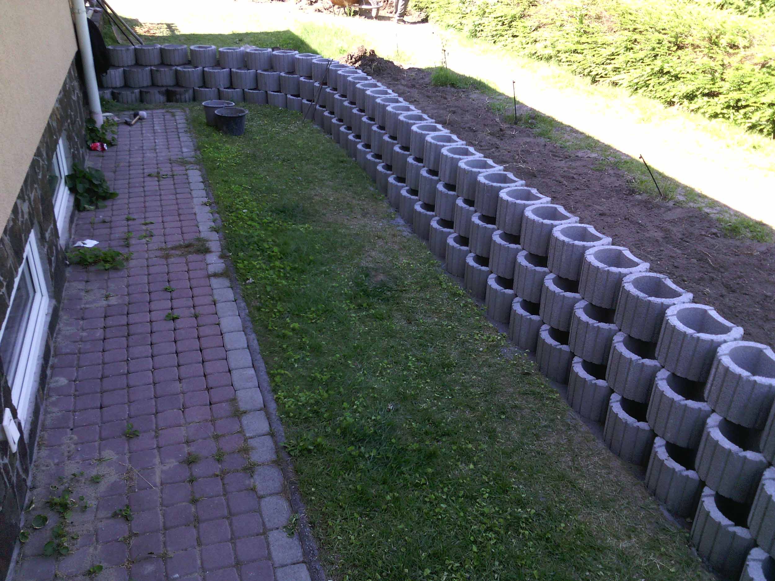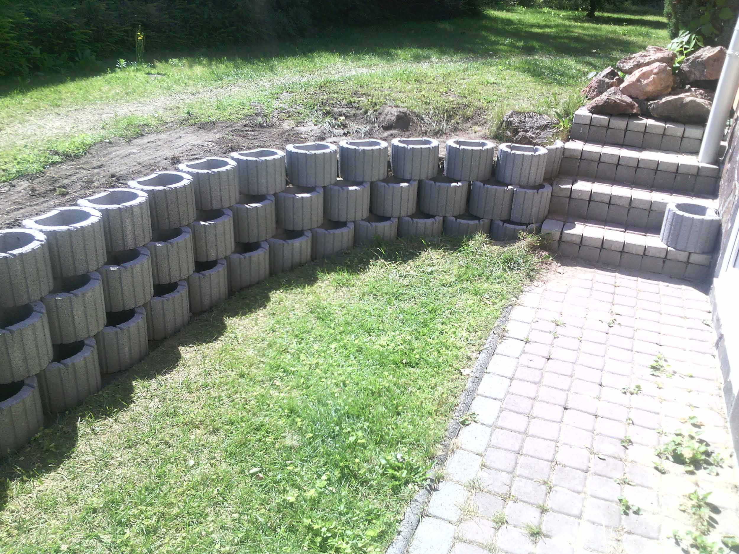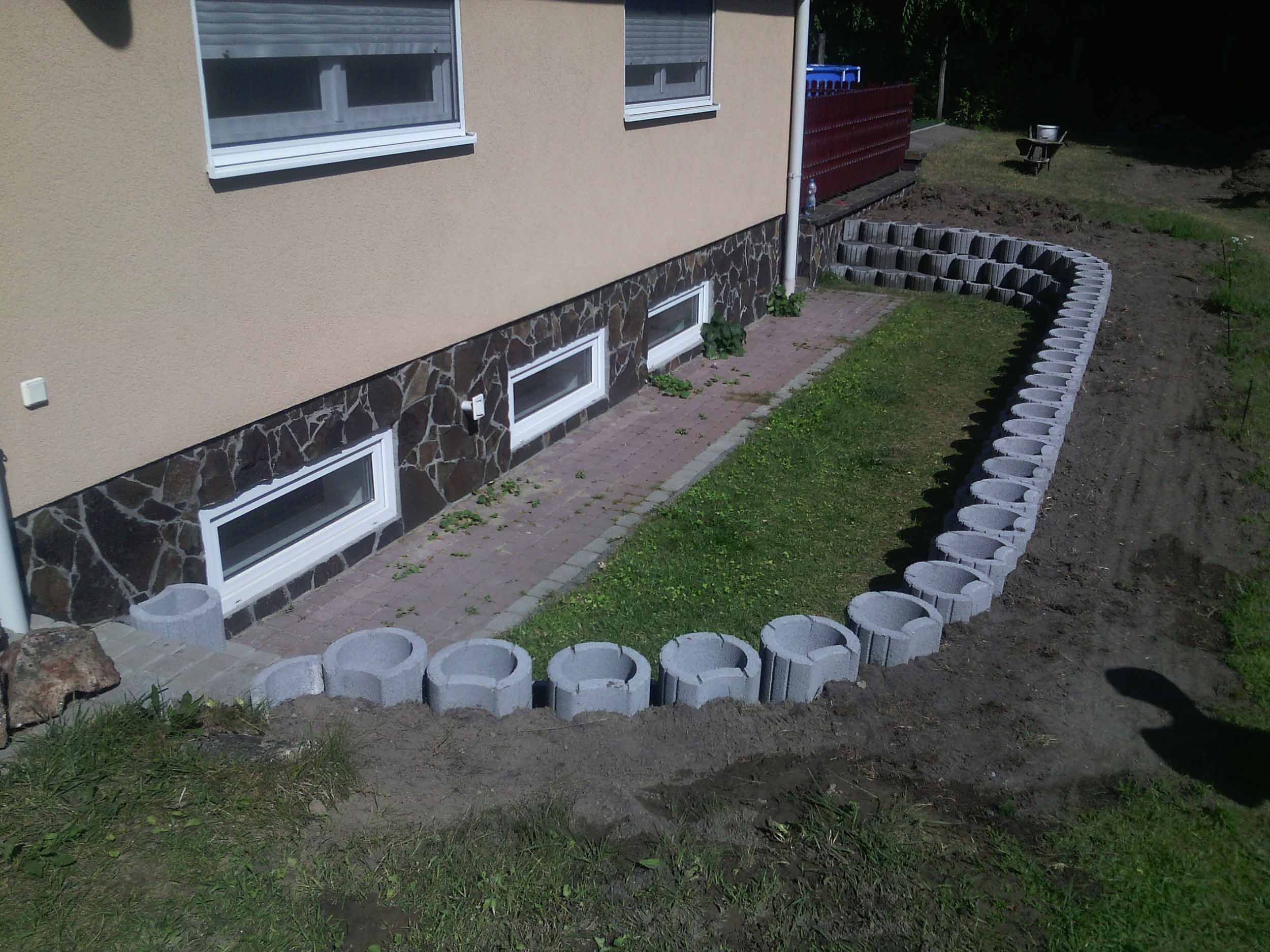 Építés: – földkitermelés alapból, – sávalap betonozás, – beton elemek felrakása, – földfeltöltés.